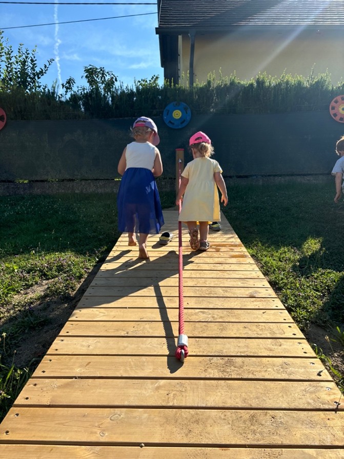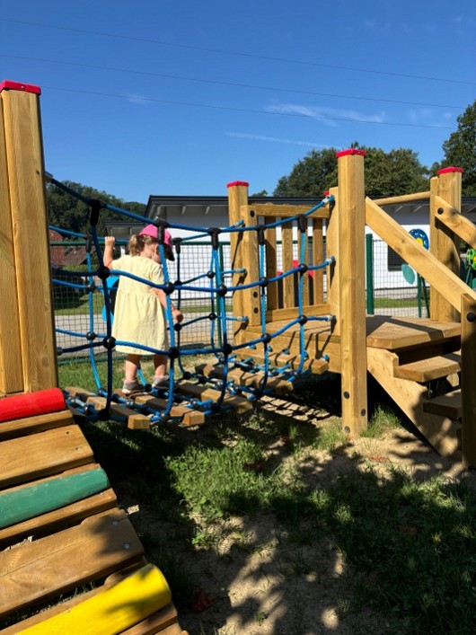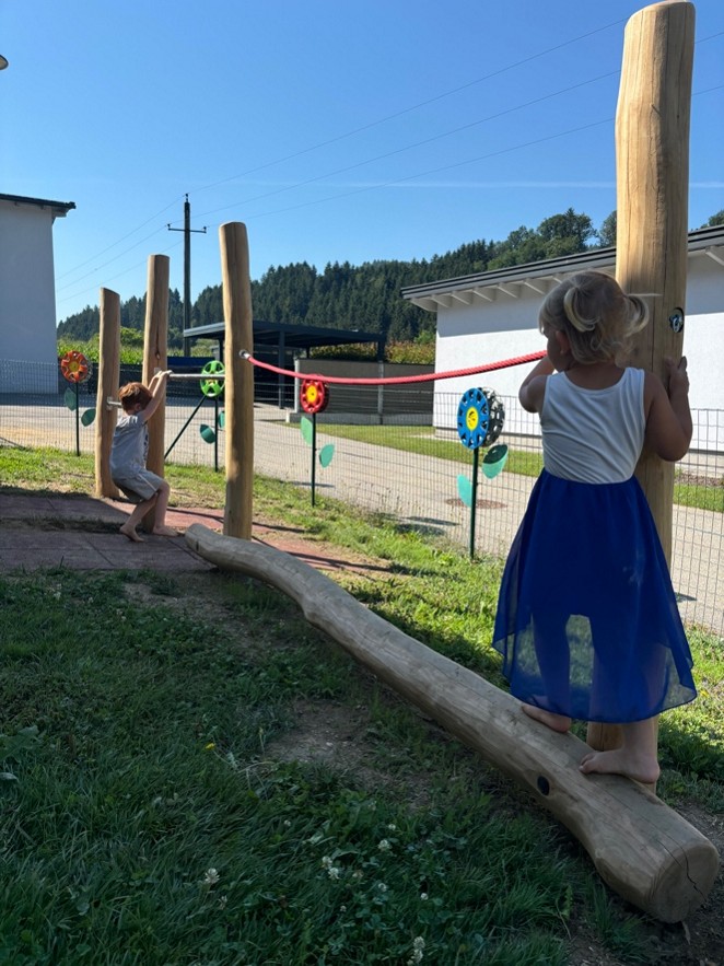 Unser großer Garten lädt die Kinder täglich zum Entdecken, Spielen und Erleben ein. Ob auf der Rutsche, an der Wasserspielbahn, in der Sandkiste oder beim Klettern und Balancieren – hier ist für jede Altersgruppe etwas dabei. Zwei Reckstangen fördern zusätzlich die Bewegungsfreude und Motorik der Kinder.